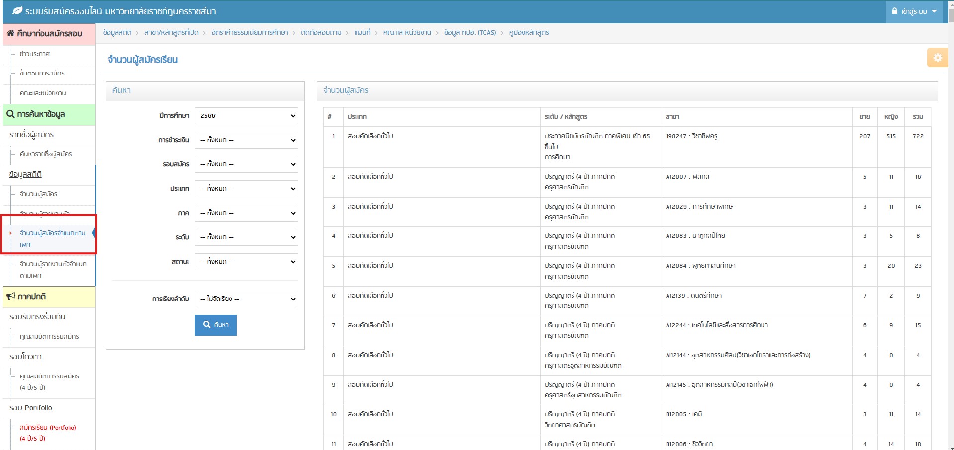 - ระบบรับสมัครนักศึกษา สถิติผู้สมัครแยกเพศ