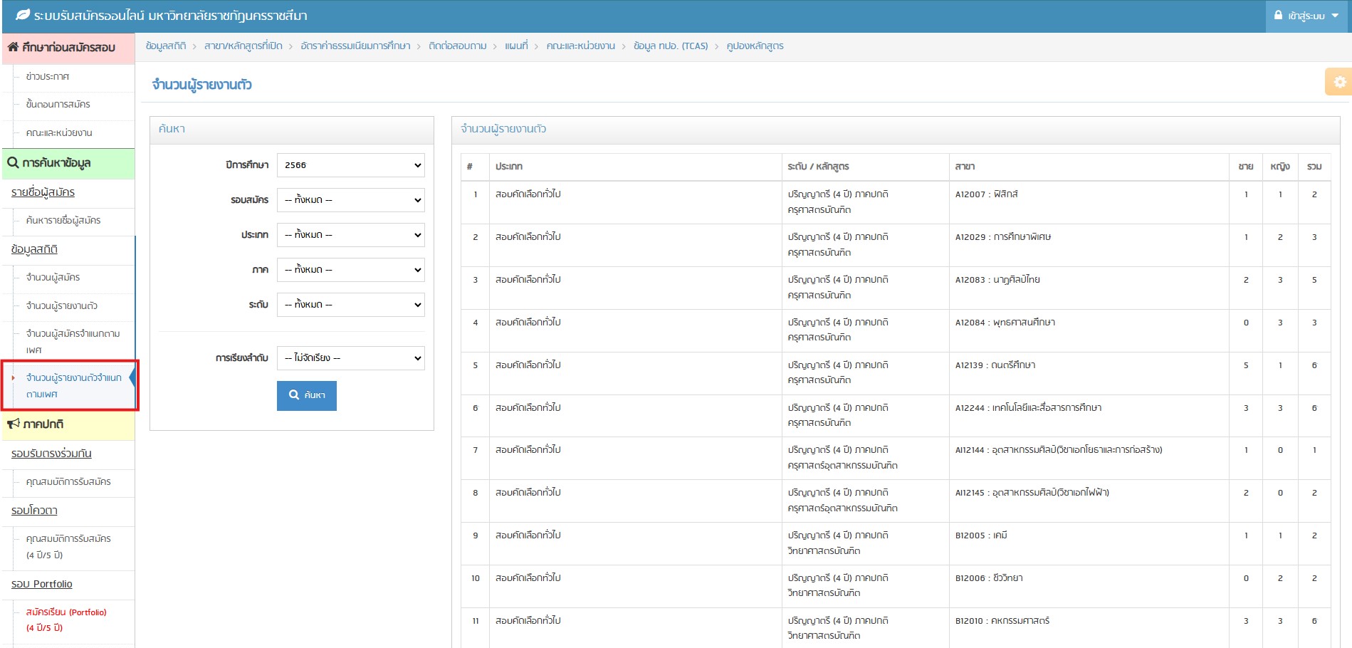- ระบบรับสมัครนักศึกษา สถิติผู้รายงานตัวแยกเพศ