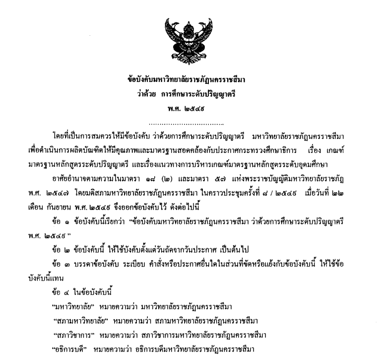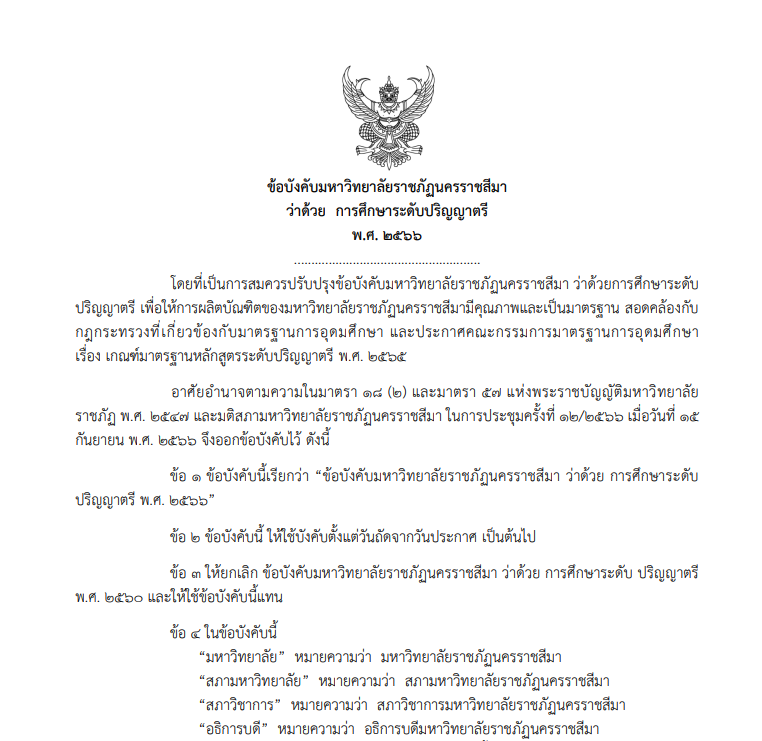 - ข้อบังคับมหาวิทยาลัยราชภัฏนครราชสีมาว่าด้วย การศึกษาระดับปริญญาตรี (2566)