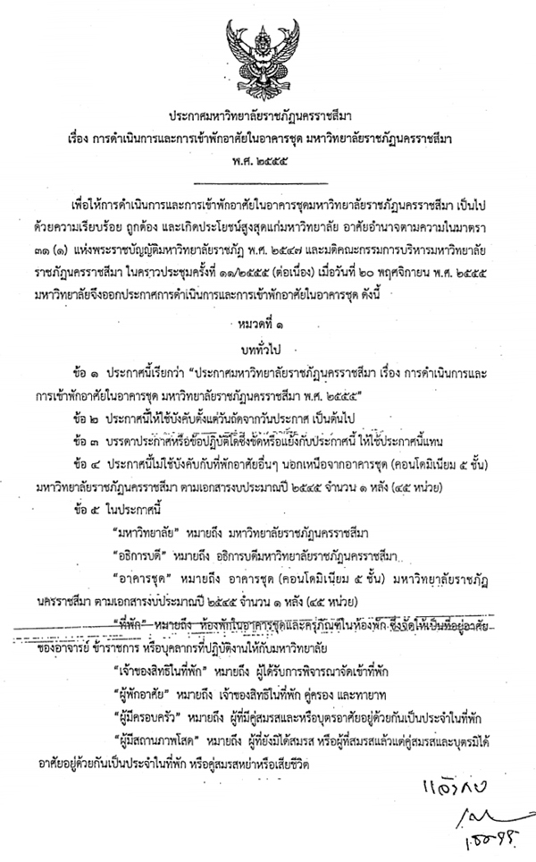มหาวิทยาลัยราชภัฏนครราชสีมา จัดให้มีที่พักอาศัยที่ราคาไม่แพงสำหรับบุคลากร ทั้งคณาจารย์และบุคลากรสายสนับสนุน ตามที่ระบุไว้ในประกาศมหาวิทยาลัยราชภัฏนครราชสีมา เรื่อง การดำเนินการและการเข้าพักอาศัยในอาคารชุด มหาวิทยาลัยราชภัฏนครราชสีมา พ.ศ.2555