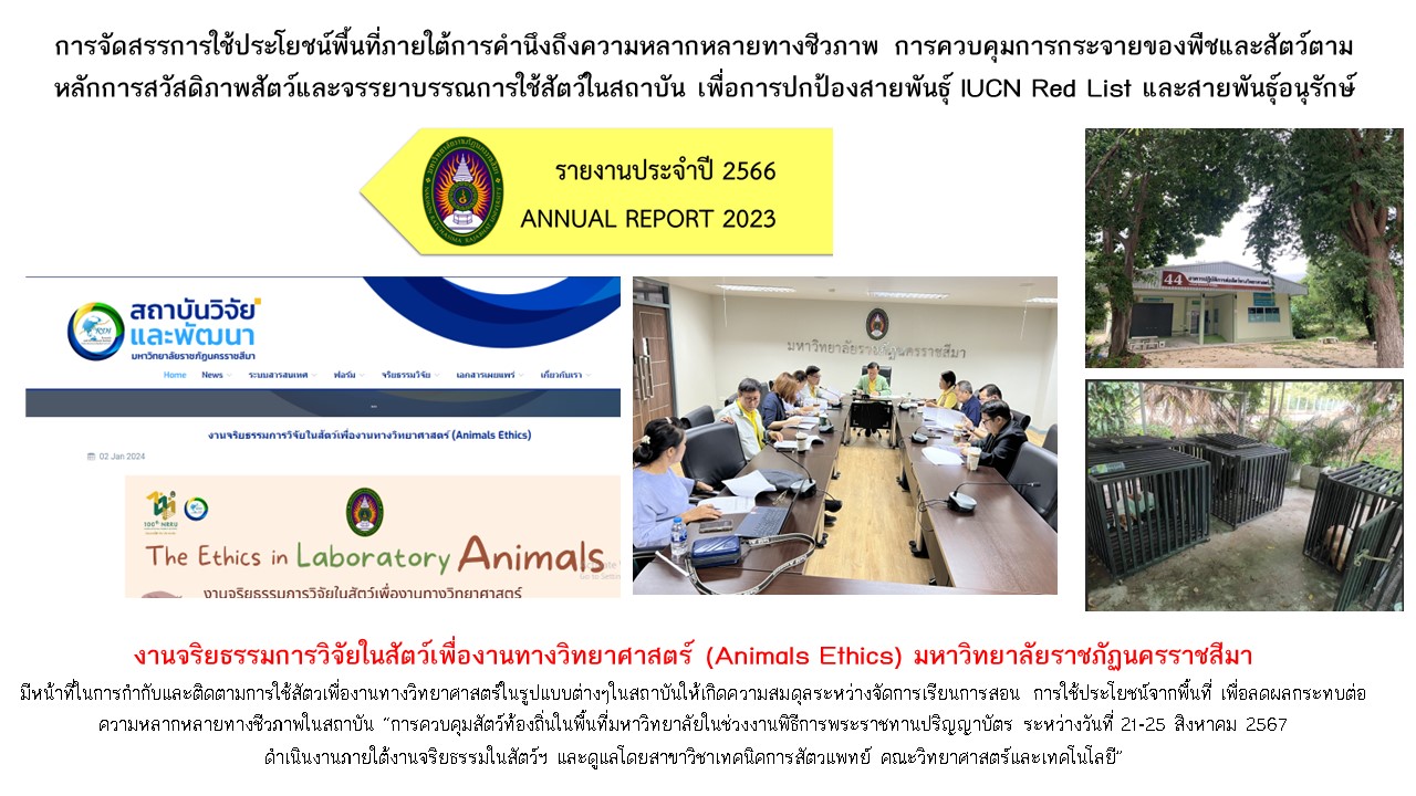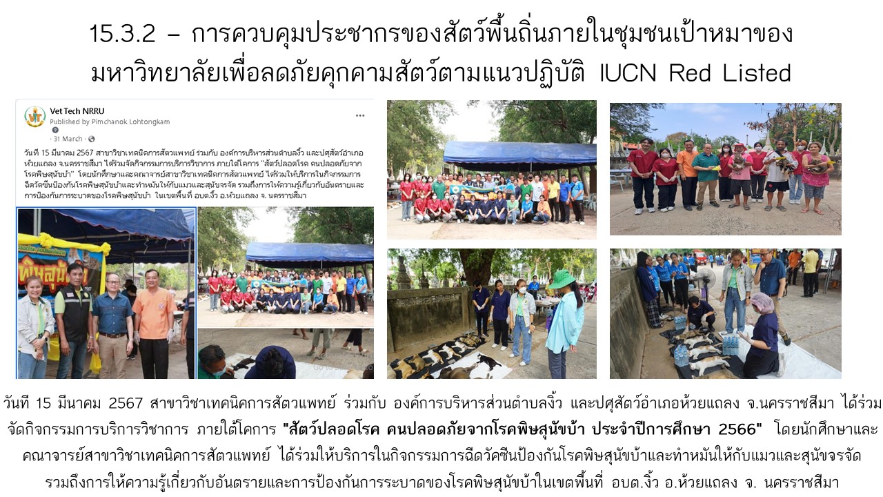 โครงการ "สัตว์ปลอดโรค คนปลอดภัยจากโรคพิษสุนัขบ้า" โดยนักศึกษาและคณาจารย์สาขาวิชาเทคนิคการสัตวแพทย์ ได้ร่วมให้บริการในกิจกรรมการฉีดวัคซีนป้องกันโรคพิษสุนัขบ้าและทำหมันให้กับแมวและสุนัขจรจัด รวมถึงการให้ความรู้เกี่ยวกับอันตรายและการป้องกันการระบาดของโรคพิษสุนัขบ้า ในเขตพื้นที่ อบต.งิ้ว อ.ห้วยแถลง จ. นครราชสีมา ในวันที 15 มีนาคม 2567 สาขาวิชาเทคนิคการสัตวแพทย์ ร่วมกับ องค์การบริหารส่วนตำบลงิ้ว และปศุสัตว์อำเภอห้วยแถลง จ.นครราชสีมา ซึ่งการจัดกิจกรรมต่างๆที่คลอบคลุม IUCN Red Listed species มหาวิทยาลัยได้มีการดำเนินงานภายใต้การกำกับดูแลของหน่วยงานจริยธรรมการวิจัยในสัตว์เพื่องานทางวิทยาศาสตร์ (Animals Ethics) มหาวิทยาลัยราชภัฏนครราชสีมา ดำเนินการโดยสถาบันวิจัย มีหน้าที่ในการกำกับและติดตามการใช้สัตว์เพื่องานทางวิทยาศาสตร์ในรูปแบบต่างๆในสถาบันให้เกิดความสมดุลระหว่างจัดการเรียนการสอน การใช้ประโยชน์จากพื้นที่ เพื่อลดผลกระทบต่อความหลากหลายทางชีวภาพในท้องถิ่น