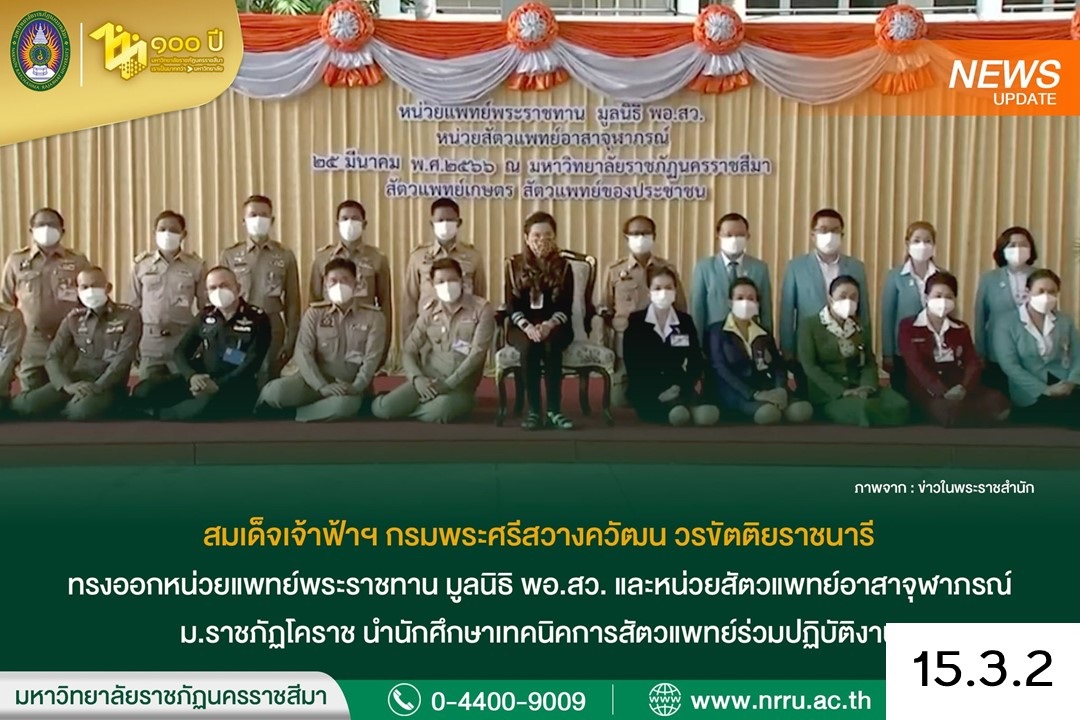 เมื่อวันที่ 25 มีนาคม 2566 สมเด็จพระเจ้าน้องนางเธอ เจ้าฟ้าจุฬาภรณวลัยลักษณ์ อัครราชกุมารี กรมพระศรีสวางควัฒน วรขัตติยราชนารี เสด็จไปยังมหาวิทยาลัยราชภัฏนครราชสีมา อำเภอเมืองนครราชสีมา จังหวัดนครราชสีมา ทรงออกหน่วยแพทย์พระราชทานและหน่วยสัตวแพทย์อาสาจุฬาภรณ์ โดยโปรดให้หน่วยแพทย์อาสาสมเด็จพระศรีนครินทราบรมราชชนนี หรือ พอ.สว.นครราชสีมา ซึ่งโปรดให้ พอ.สว.จังหวัดนครราชสีมา ประกอบด้วย แพทย์ พยาบาล และเจ้าหน้าที่จากสำนักงานสาธารณสุขจังหวัดนครราชสีมา, โรงพยาบาลมหาราชนครราชสีมา, โรงพยาบาลเทพรัตน์นครราชสีมาและหน่วยงานในสังกัด, ศูนย์อนามัยที่ 9 นครราชสีมา, คลินิกอบอุ่นมหาชัย และสาธารณสุขอำเภอเมืองนครราชสีมาและหน่วยงานในสังกัด ออกหน่วยให้บริการตรวจรักษาแก่ประชาชน มีการจัดให้การอบรมให้ความรู้แก่ผู้นำชุมชนเรื่องโรคพิษสุนัขบ้า สร้างความรู้ความเข้าใจเกี่ยวกับโรคพิษสุนัขบ้าสำหรับนำไปเผยแพร่แก่ประชาชนเพื่อช่วยลดปัญหาสุนัขจรจัด และโรคพิษสุนัขบ้าในสัตว์เลี้ยง พร้อมขับเคลื่อน การมีส่วนร่วมของภาคีเครือข่าย ทุกภาคส่วนในการกำจัดโรคพิษสุนัขบ้าให้หมดไป ตามแผนยุทธศาสตร์การดำเนินโครงการสัตว์ปลอดโรค คนปลอดภัย จากโรคพิษสุนัขบ้า ตามพระปณิธาน (ภาพกิจกรรมการบริการวิชาการ วันที่ 25 มีนาคม 2566)