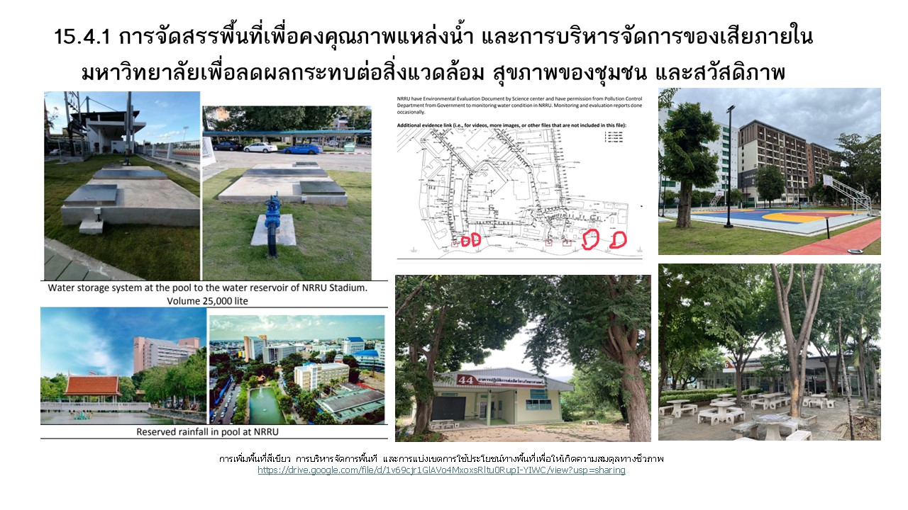 มหาวิทยาลัยราชภัฏนคราชสีมามีแนวนโยบายด้านการอนุรักษ์ทรัพยากรธรรมชาติและสิ่งแวดล้อมอย่างสร้างสรรค์ สมดุล และยั่งยืน ภายใต้ แผนยุทธศาสตร์มหาวิทยาลัยราชภัฏนครราชสีมา 5 ปี 2566-2570 (ยุทธศาสตร์ที่ 4 การยกระดับเศรษฐกิจ สังคม ศิลปวัฒนธรรมและสิ่งแวดล้อมของท้องถิ่นเพื่อสร้างความเข้มแข็งของชุมชน หน้าที่ 17-20) ฉบับปรับปรุงเดือนสิงหาคม 2566 และมหาวิทยาลัยราชภัฏนครราชสีมาจัดทำแผนปฏิบัติการ 5 ปี (พ.ศ. 2566-2570) เพื่อเป็นการกำหนดขอบเขตของการดำเนินงานด้านการส่งเสริมการอนุรักษ์และการฟื้นฟูทรัพยากรธรรมชาติและสิ่งแวดล้อมฯโดยระบุไว้ในยุทธศาสตร์ที่ 4 การยกระดับเศรษฐกิจ สังคม ศิลปวัฒนธรรมและสิ่งแวดล้อมของท้องถิ่นเพื่อสร้างความเข้มแข็งของชุมชน (หน้า 35-38) โดยเน้นกลยุทธในการ 1) ส่งเสริมการพัฒนาและสร้างระบบบริการวิชาการให้มีความต่อเนื่องและดียิ่งขึ้น และ 2) แสวงหาภาคีเครือข่ายความร่วมมือในการสร้างพื้นที่ต้นแบบการพัฒนาท้องถิ่นแบบองค์รวมอย่างยั่งยืน เพื่อเป็นการรับสร้างความเชื่อมั่นด้านการอนุรักษ์ ฟื้นฟู และการใช้ระบบนิเวศบนบก โดยเฉพาะอย่างยิ่ง ป่าไม้ ภูเขา และพื้นที่แห้งแล้งที่เกี่ยวข้องกับมหาวิทยาลัยอย่างยั่งยืนโดยมีการวางแผนการกักเก็บและจัดสรรพื้นที่ผ่าน NRRU Water Conservation Program Implementation ภายใต้กรอบ แผนยุทธศาสตร์ 5 ปี (2566-2567)